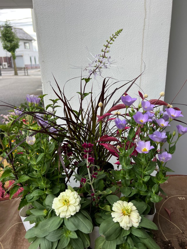 ① ピンクトルコ・赤ケイトウ ②ピンクトルコ・黄色ケイトウ ③紫トルコ・赤ケイトウ ④紫トルコ・黄色ケイトウ *トルコキキョウシェリー 1ポット *ケイトウ ライオンハート 3ポット *ユーパトリウム チョコレート 1ポット *秋明菊 ハドスベン 1ポット