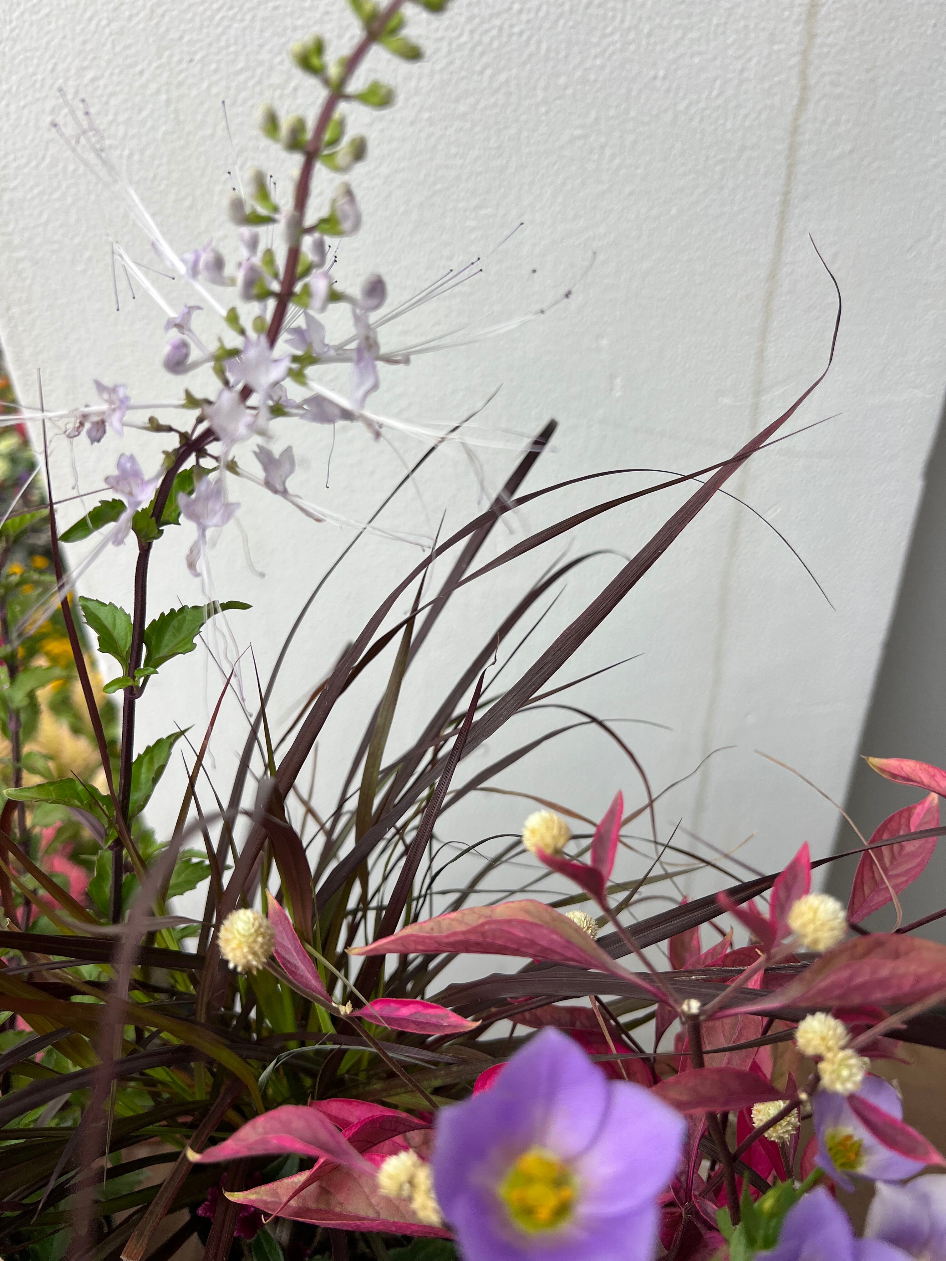 トルコキキョウシェリーブルー、八重咲きジニアをメインに、アルテルナンテラやネコノヒゲや、パープルファウンテングラスなど 8ポットセット